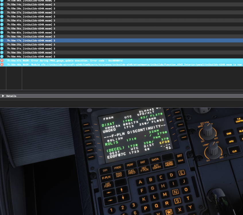 1. I just had a wasm crash when I was changing the landing runway in the MCDU. I already had a landing runway set for EDDF, noticed that there was a runway change, when I changed the runway the WASM crashed. Information Aircraft: A340 EIS1 Passenger Simulator: FS2024 Navdata Method: NAVIGRAPH OFP: KDTW-EDDF Specs: Ryzen 7800X3D, RX 7900XTX, 32GB RAM Autosave: Attached latest .BIN file before crash WASM: WASM: Error during FMGS_gauge_update execution. Error code : 0xc000001d WASM: Module vfs://inibuilds-aircraft-a340/SimObjects/Airplanes/inibuilds-a340/attachments/inibuilds/Function_A343_Interior/panel/inibuilds-A340.wasm is now dirty 1760201968.bin