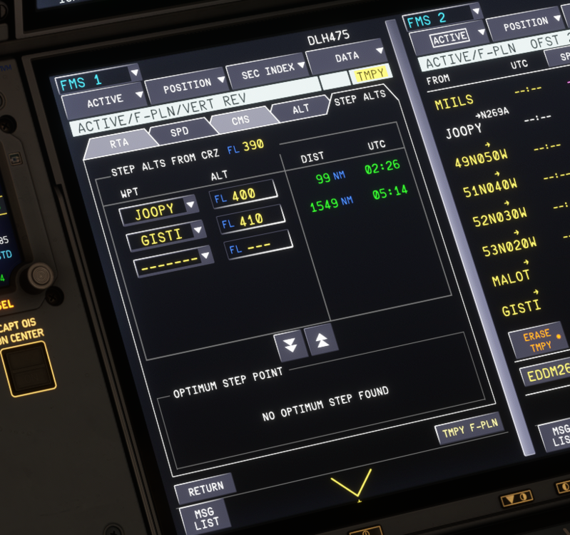 MSFS2020 1.0.7 The step climbs entered into the FMS aren't properly inserted into the flight plan. In the example shown in the pics, the step climb from F390 to F400 at JOOPY then strangely shows FL389 next to S/C then FL390 at the next waypoint (miles away) before FL400 at the following waypoint.