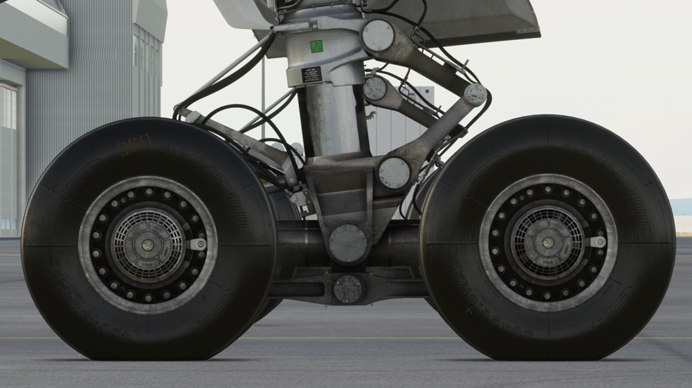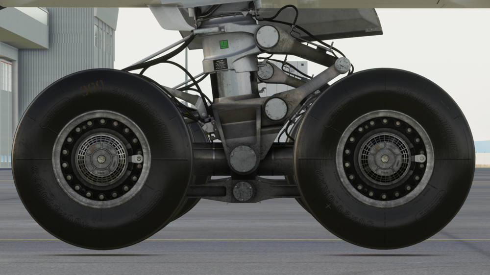 This photo shows the state of the landing gear from the same perspective when the aircraft is at its lightest and heaviest weights. The suspension is moving properly, but the tires are also sinking and floating unnaturally. This issue needs to be corrected first. Additionally, the suspension's range of motion seems too narrow. It should compress more under maximum weight. Increasing the suspension's range of motion would make it appear more realistically compressed during landing. The current suspension of the iniBuilds A350 simply lacks sufficient compression. -