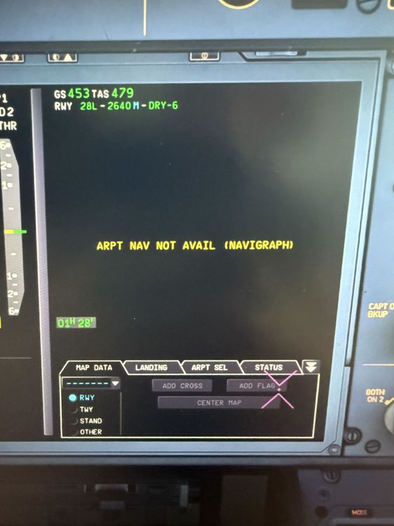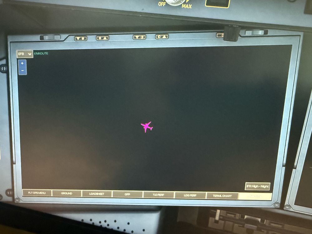 When during cruise in plan mode while being in the temporary flight plan (e.g. after entering the arrival route), the ND and the MCDU show the full route, even the waypoints already passed. However, when browsing back to waypoints already passed, the ND shows their position along the route, but all are named as the waypoints already passed you are currently flying away from. Example: Enroute from waypoint MAPOX to SPY, I can browse back along my route (in TMPY FPLN) even to waypoints already passed, but they all are named MAPOX). Also, when centering on a waypoint before MAPOX, the route shown on the ND (green / yellow mixed line) toggles somehow as if the route was constantly being recalculated. Besides, my EFB stopped reloading the IFR Enroute map. Apparently once I was out of the map sector being previously loaded, the map is not being updated anymore. The little pink airplane moved out of the map and now flies peacefully over a black background…. Changing the map (VFR, World etc) and changing the zoom factor didn’t change a thing.