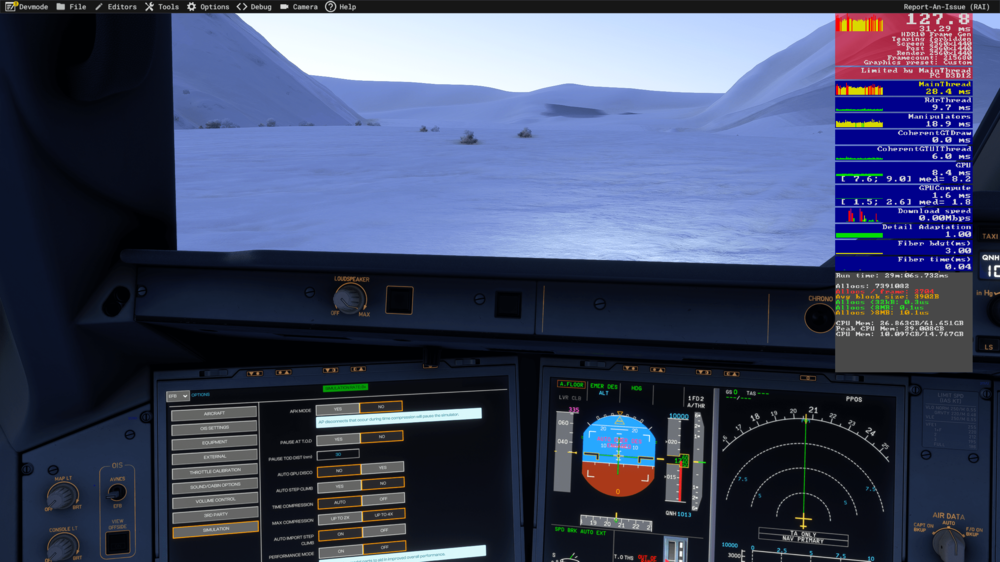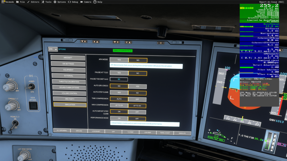 If I go to London, Heathrow in the Western Hemisphere which is rather heavy on framerate and performance the sim has no issues with keeping it at 4x time compression. In-fact I can actually force it to 8x time compression with the SIMULATION_RATE_UP sim var