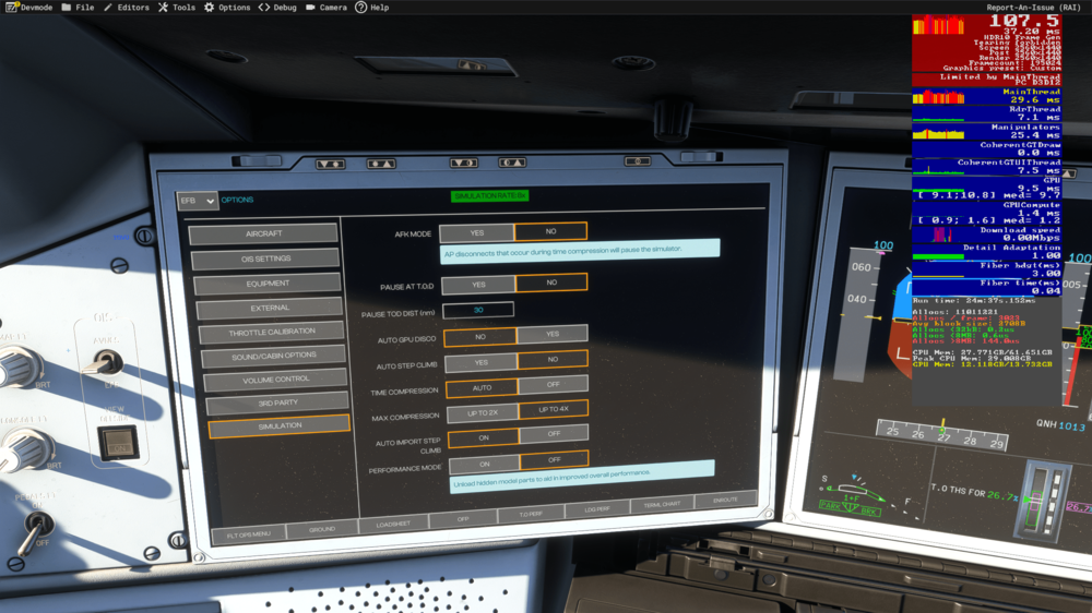 Here we can see at London Heathrow the Simulation Rate is at 8x despite us having 107.5 FPS almost half.