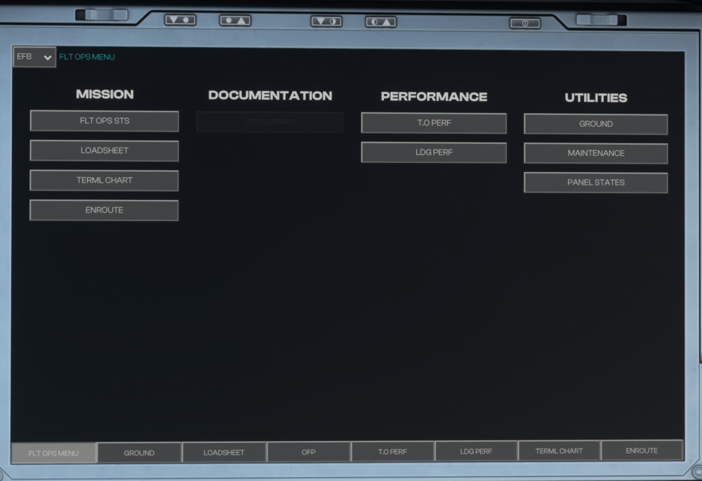 Messing around on the FO side I somehow got it to show the complete menu, but have no idea what the sequence of actions was to get there because I was clicking on one thing after another with not much affect for quite some time. I cannot get that to switch to the captains side. Very frustrating. Also frustrating the turning on the beacon light after fueling removes the GPU and powers down the AC if the engines aren't running. Anyway I need some detailed documentation on how the OIP/EFB startup works. Haven't been able to find it. I would think the default behavior on powering up would be the capt side full OIP but that is not the case.