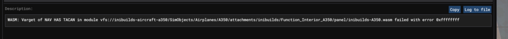 When is update the navdata to the new version by using the OIS, the avionic system, FMS and Flight contol units and etc was frozen. After i delete the A350 wasm folder, then manually update the navdata and trying to log in to my navigraph the same thing happened every system is freezing . When i am checking the wasm, the following error code was popped up. By the way the older navdata does not have this issue, only for new version navdata.