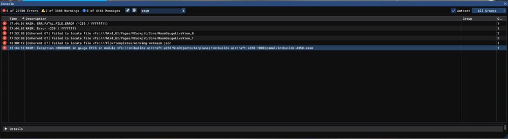 飞机:A350-900、A350-1000 模拟器:FS2020 Navdata 方法:Navigraph OFP: Not required, happens on any route 规格: i7-13700kf、4070Ti、48GB RAM WASM 错误代码: WASM: Exception c0000005 in gauge EFIS in module vfs://inibuilds-aircraft-a350/Sim0bjects/Airplanes/inibuilds-aircraft-a350-1000/panel/inibuilds-A350.was 错误重现: This error will recur any time TCAS is turned on