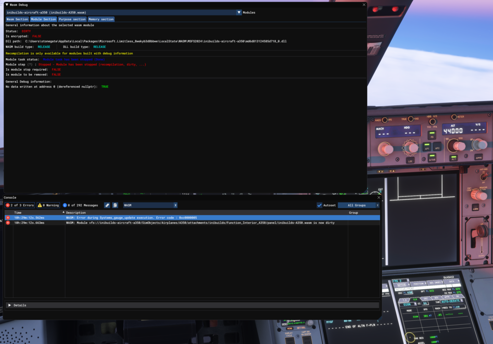 WASM: WASM: Error during Systems_gauge_update execution. Error code : 0xc0000005
