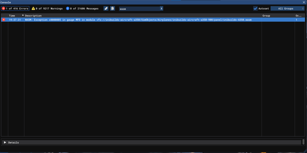 WASM Error: WASM: Exception c0000005 in gauge MFD in module vfs://inibuilds-aircraft-a350/SimObjects/Airplanes/inibuilds-aircraft-a350-900/panel/inibuilds-A350.wasm