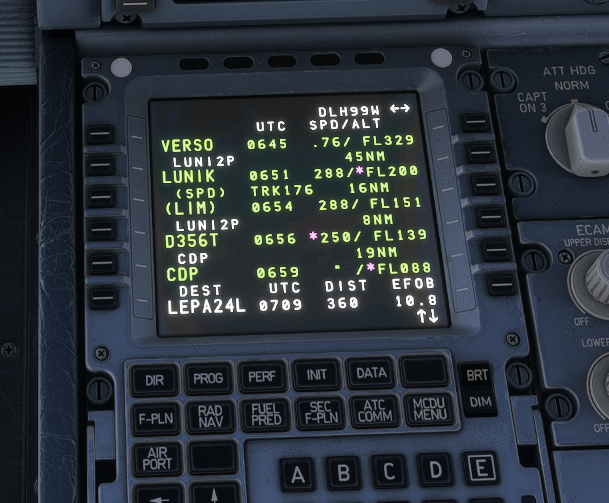 There is a discrepancy between the target speeds on the F-PLN page and the PERF pages. For example here, The F-PLN page shows the descent and .76 and then 288 on conversion, whereas the DES page shows .79 and 289 on conversion.