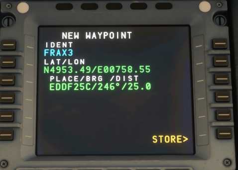 I wanted to create a pilot waypoint for my EOSID on the secondary. So I typed in FRAX3 on the secondary which then popped up the "NEW WAYPOINT" page with "FRAX3" pre-entered for IDENT, then I entered "EDDF25C/246/25" into "PLACE/BRG /DIST" and it filled it, so far so good, but then when I tried to store it, by clicking "STORE>" I noticed that nothing happened anymore.