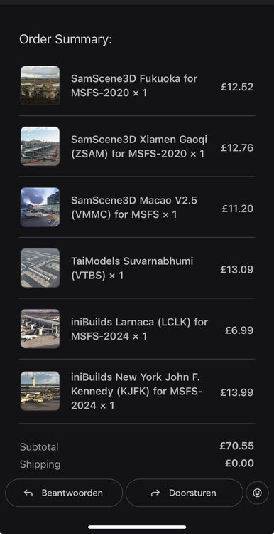 1. Hi, i bought a couple of new sceneries and unfortunately discovered that i bought a wrong item. I intended to buy the VTBS for MSFS20/24 but accidentally bought the X-Plane version. Is it possible to swap them and charge me with rest that has to be paid. Order number is #406673. Thank you for your help.