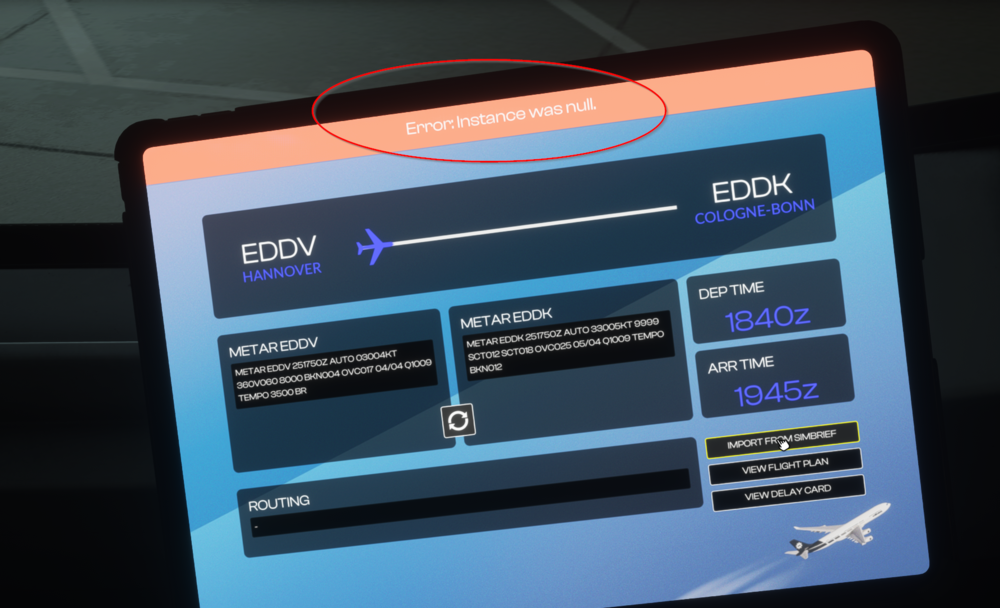 I'm having a problem with my A340 since update 1.0.4. When importing Simbrief Plan, I keep getting the message "Error: Instance was null."