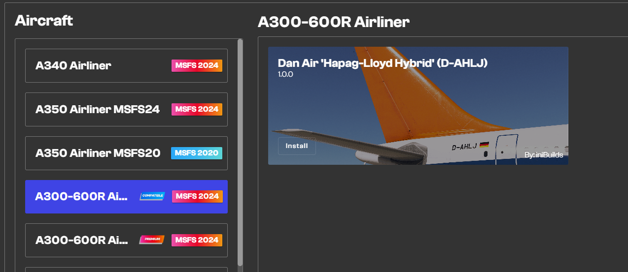 Woolies Posted Tuesday at 10:56 AM Posted Tuesday at 10:56 AM Yeah, this would be great. I was actually looking for the Dan Air 'Hapag-Lloyd Hybrid' (D-AHLJ) for the PREMIUM but there isnt one?? Can INI make more of the COMPATIBLE liveries available for the PREMIUM in 2024, would be amazing for sure.