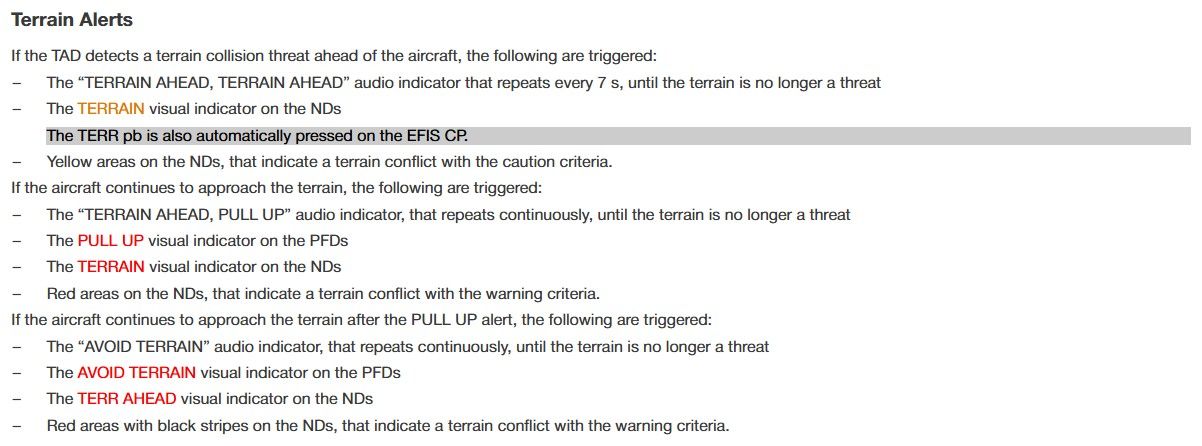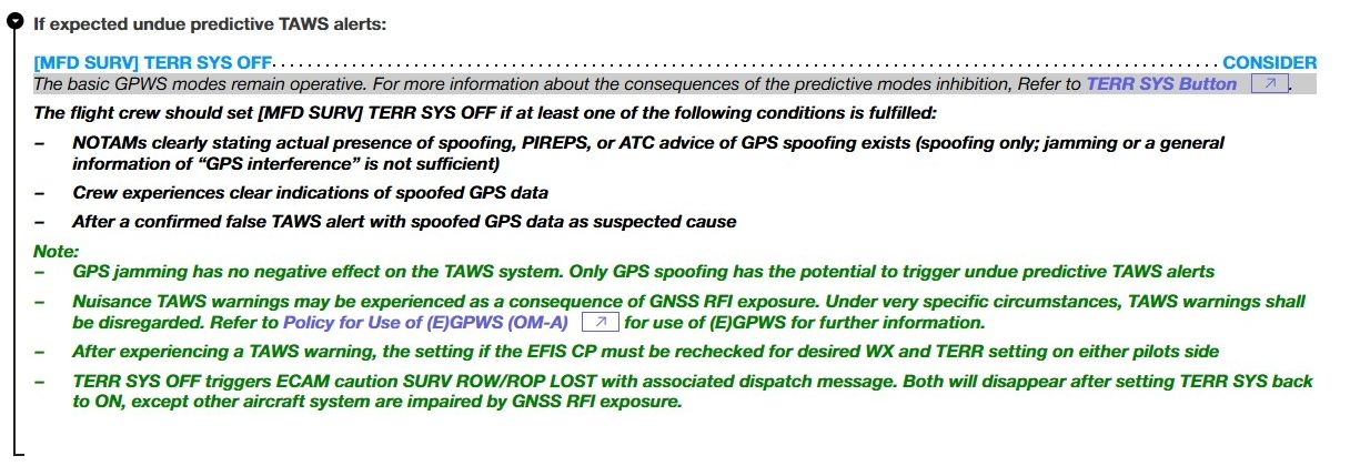 Michael G. Posted 18 hours ago Posted 18 hours ago (edited) Hello dear iniBuilds Team, With the amount of GPS interference increasing and thus being exposed more frequently to it, I was wondering regarding the TERR SYS. The GPS interference triggers spurious TAWS warnings (PULL UP). According to the Supplementary Procedures for GNSS Interference, it suggests to consider turning the TERR SYS off: After turning TERR SYS off, the spurious PULL UP warnings should then cease if I understand correctly: TAD: Terrain Awareness Display TCF: Terrain Clearance Floor What I was wondering, the iniBuilds A350 still continues generating those warnings, even after disabling the TERR SYS via the MFD. Is this correct system behavior? Any real A350 pilots on here who can shed some light on this? 😇 ----- Aircraft Update Version: v1.2.1 / MSFS2024 Edited 18 hours ago by Michael G. Added Aircraft updat version and flight sim Regards Michael Göbel