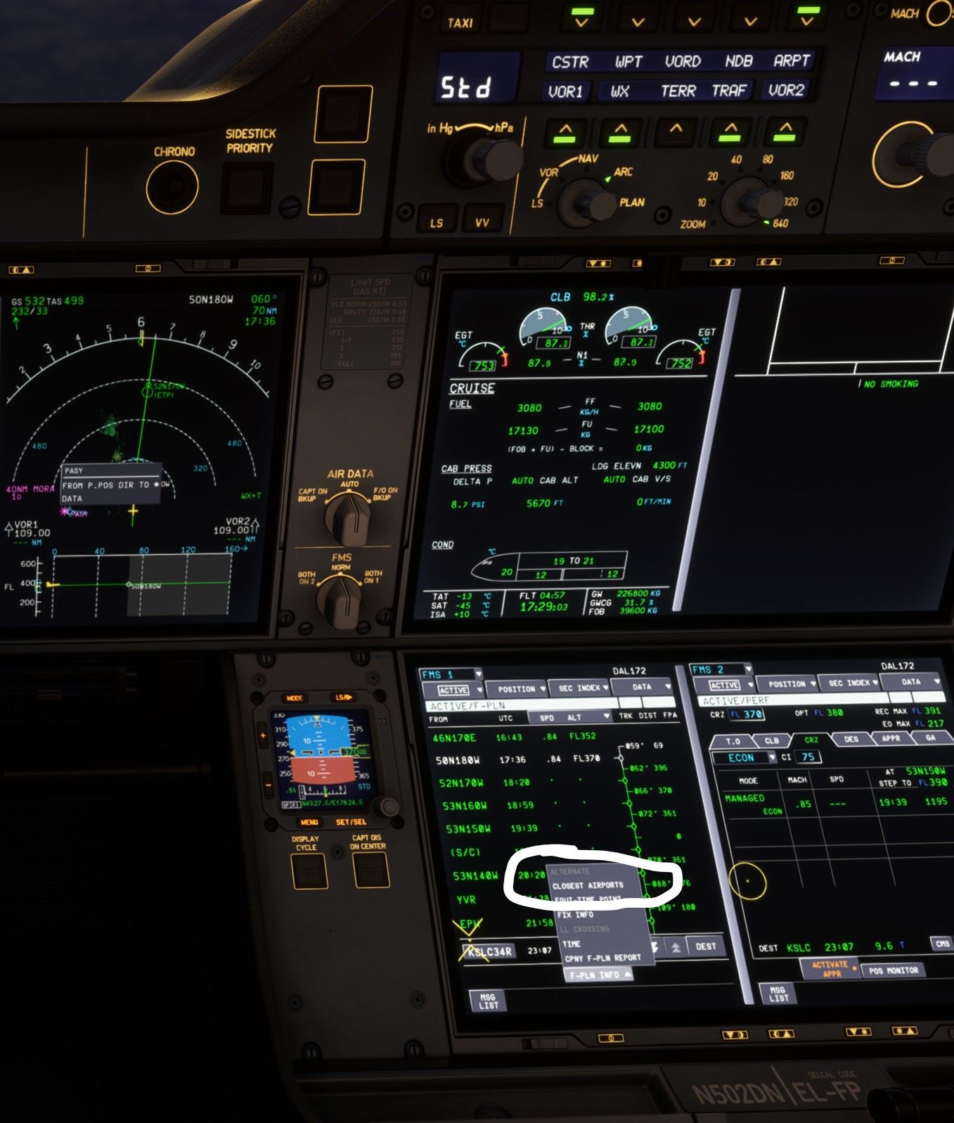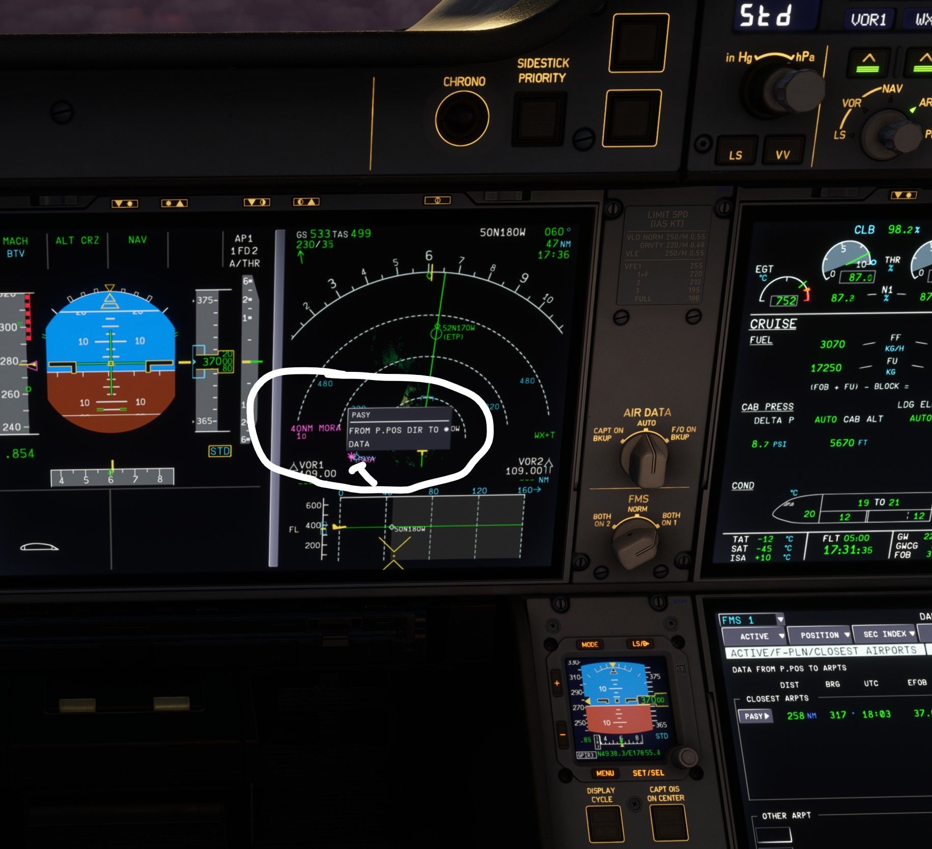 Brazeagle Posted Tuesday at 05:13 PM Posted Tuesday at 05:13 PM (edited) Finding a nearest airport with a suitable RWY for landing on a descent emergency with a A350. On the FMS, click on F-PLN INFO and select Closest Airport. There you will find all airport data and navigation instructions to that airport. Then, on the PFD, click on top of the airport (once you selected ARPT on the MCP and select FROM P.POS DIR TO and from here you can set up your approach normally. Hope this helps someone. Thank you, Brazeagle Edited Tuesday at 05:34 PM by Brazeagle